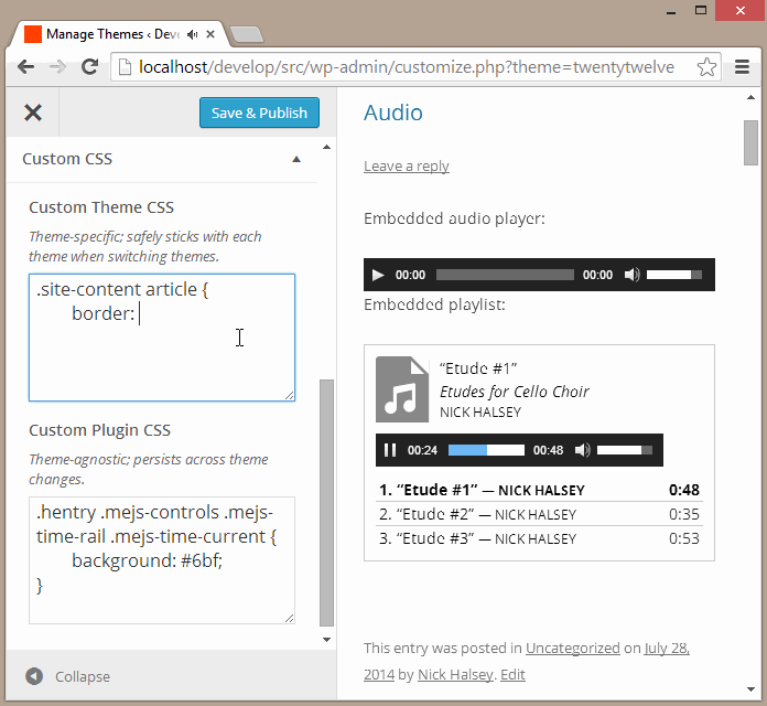 To further improve the user experience, the Customizer offers an API for managing setting changes directly in JavaScript, allowing for truly-live previewing. The below images show a comparison of a Custom CSS option that leverages this technology, called postMessage, versus the standard refresh option: