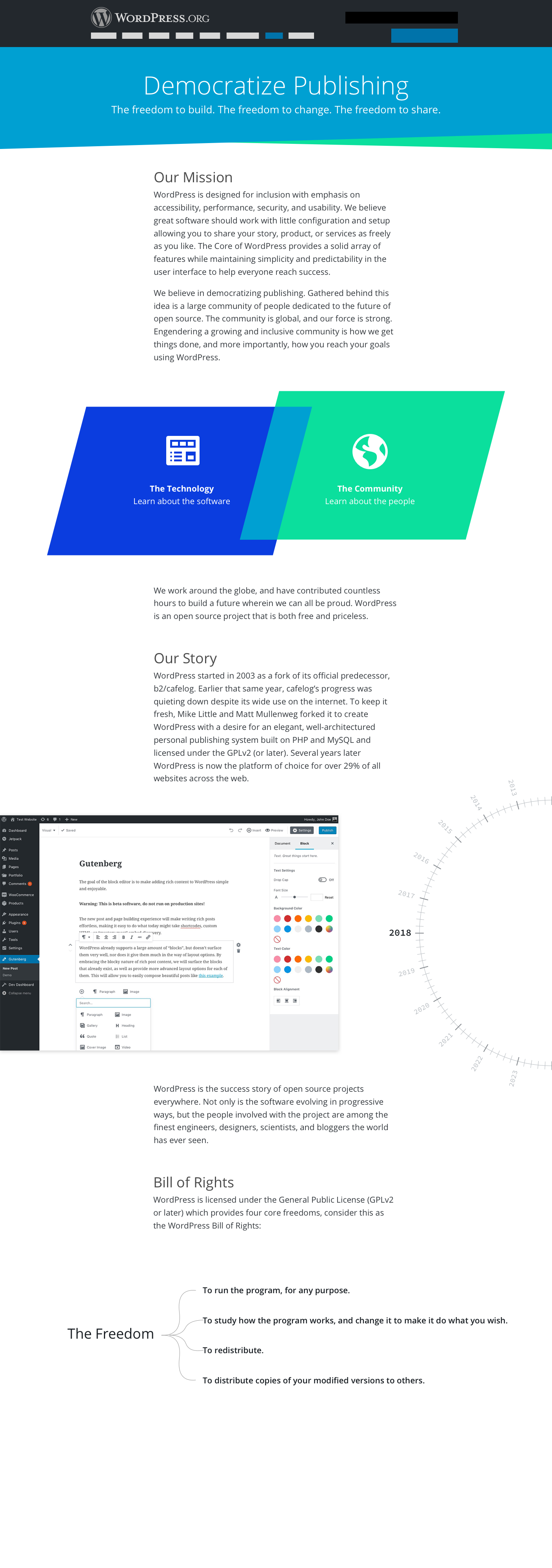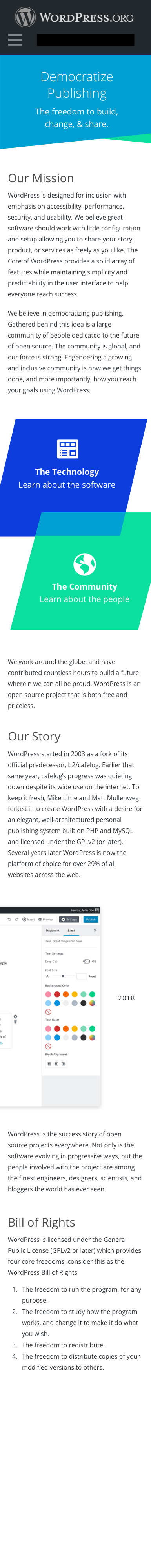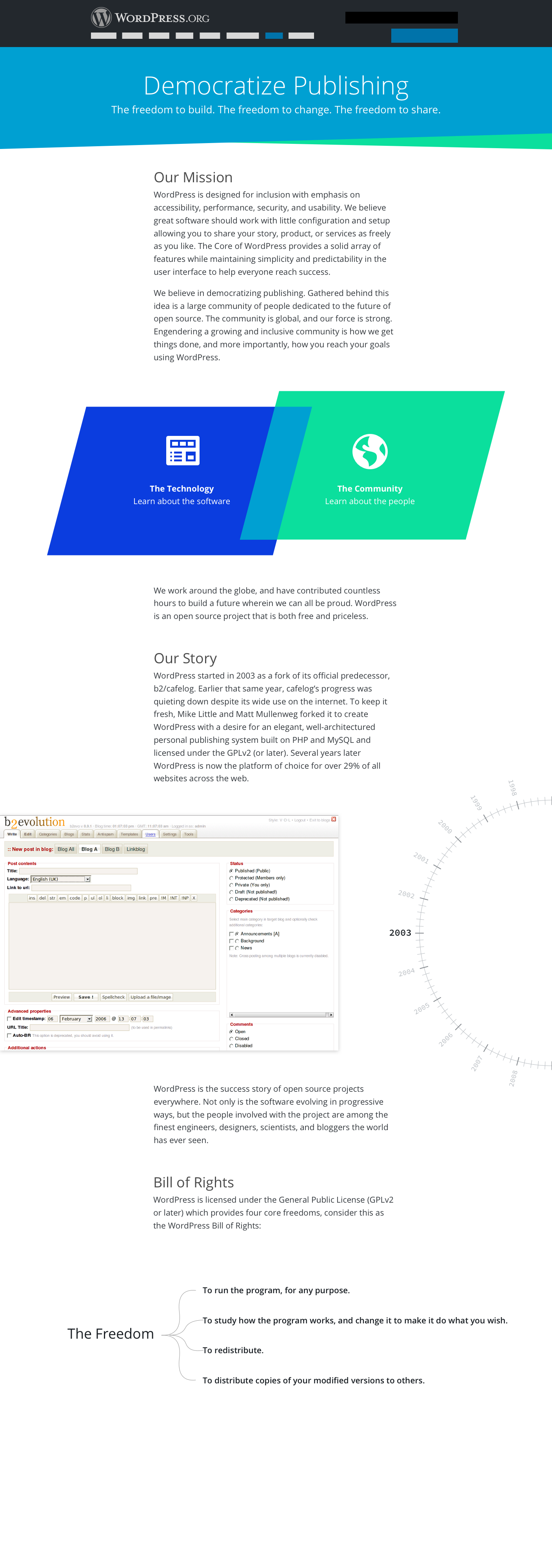 I wanted to organize the content in the whole About section, but that might be further out. So for now I envisioned the About page as a way to talk about both the technology AND the community. These two are what makes up the whole of WordPress. I propose 3 sections: Our Mission, Our Story, the Bill of Rights.