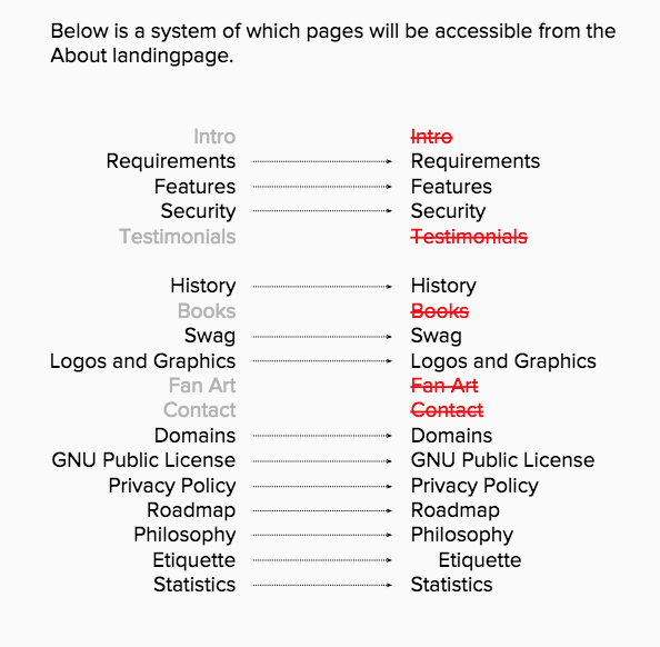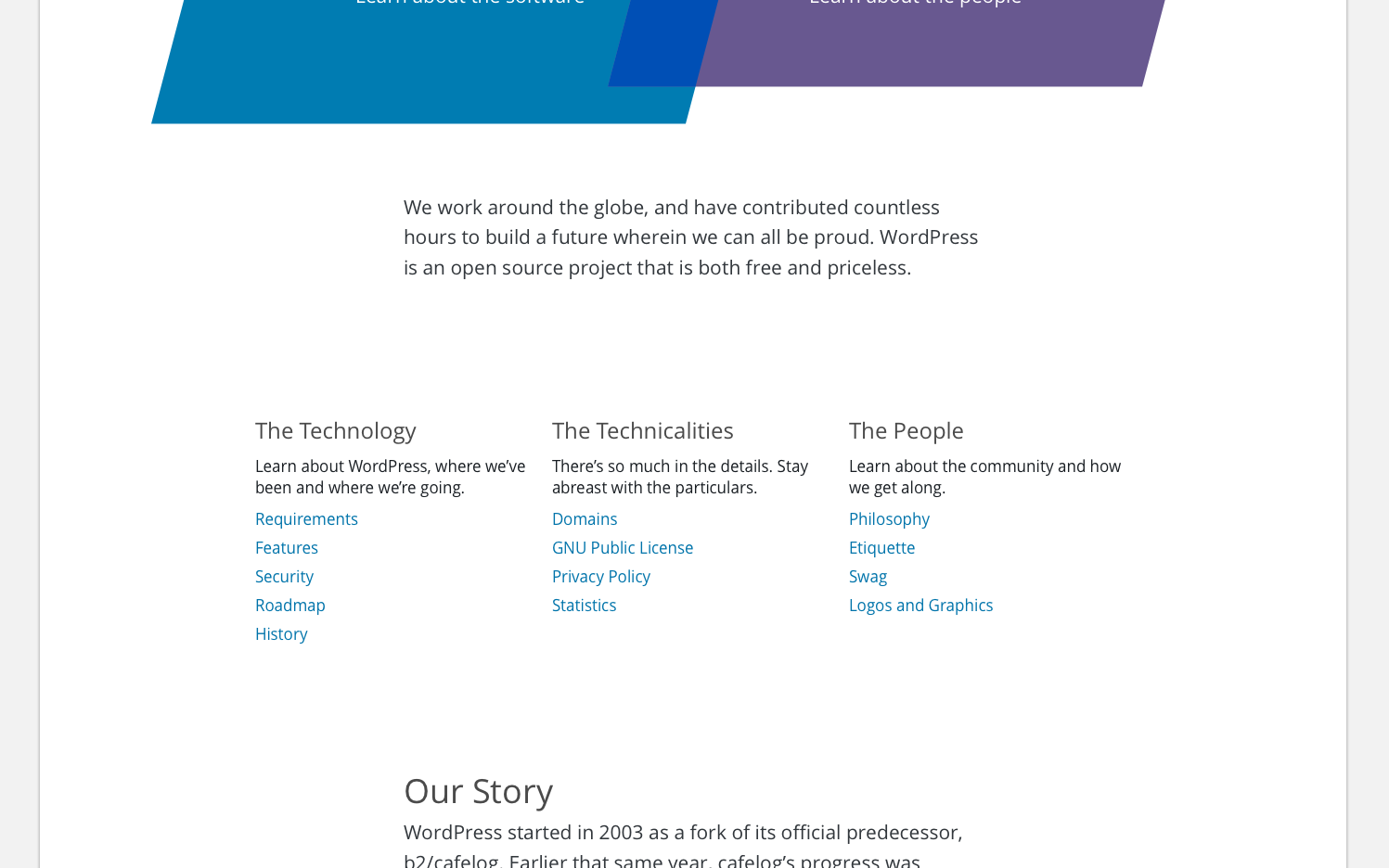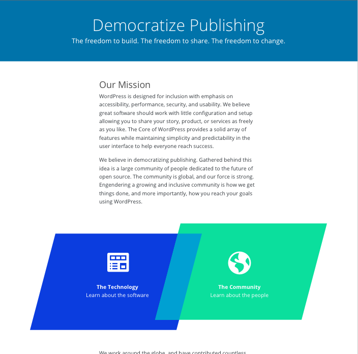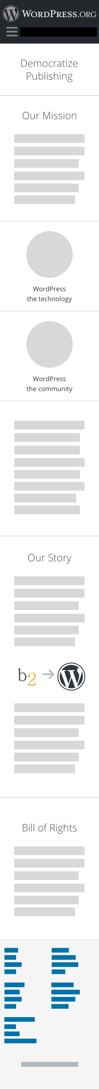 I wanted to organize the content in the whole About section, but that might be further out. So for now I envisioned the About page as a way to talk about both the technology AND the community. These two are what makes up the whole of WordPress. I propose 3 sections: Our Mission, Our Story, the Bill of Rights.