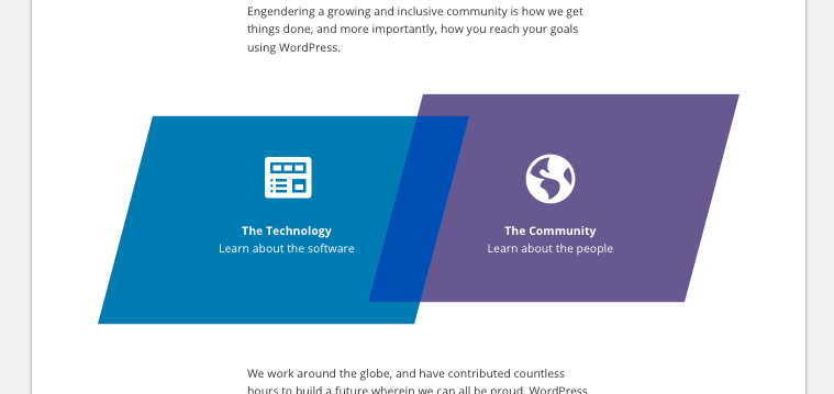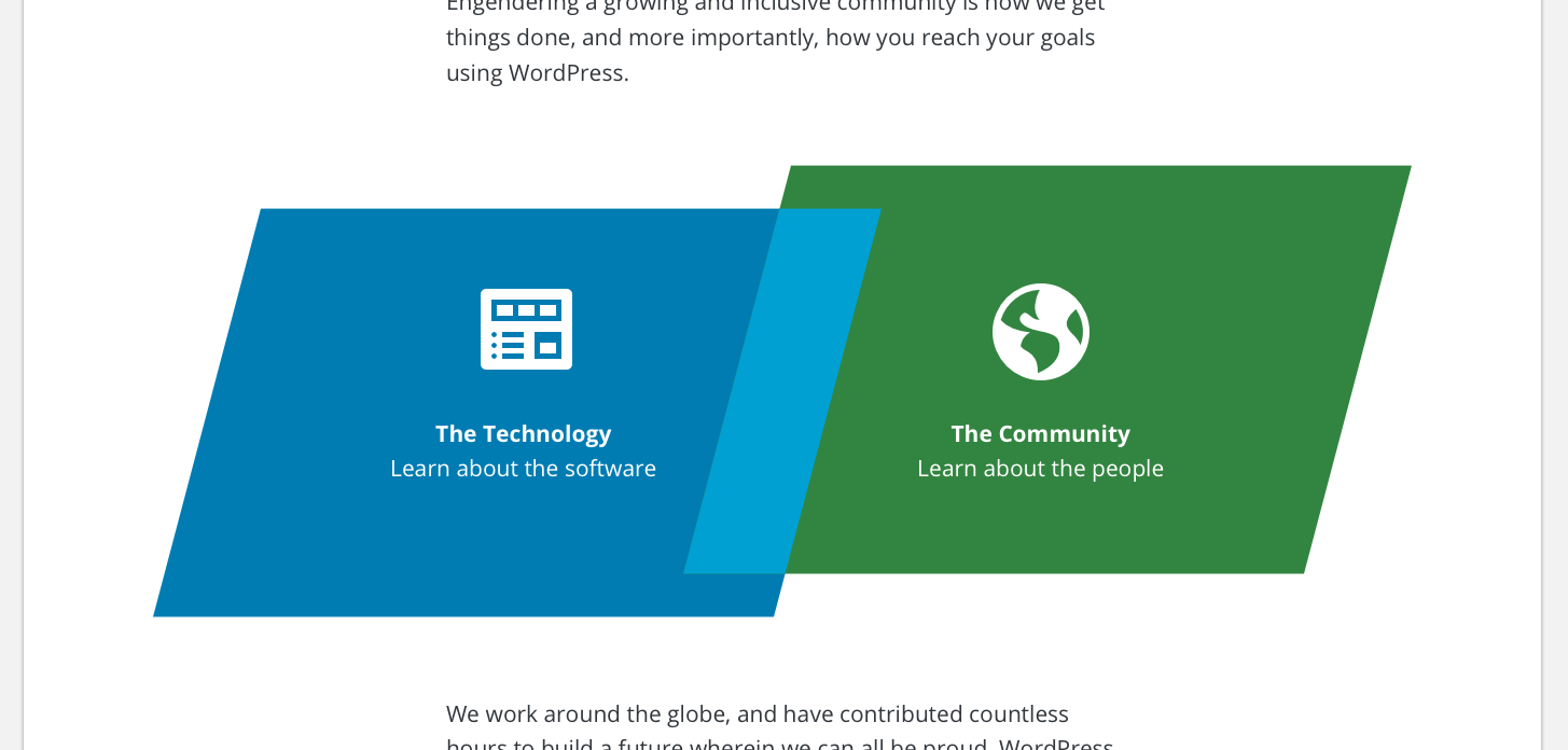 This page is geared to engage new people learning about WordPress, and strengthen the purpose of WordPress for those already active in the community. By splitting into two sections of Technology & Community, I hope to guide people into their sections of interest.