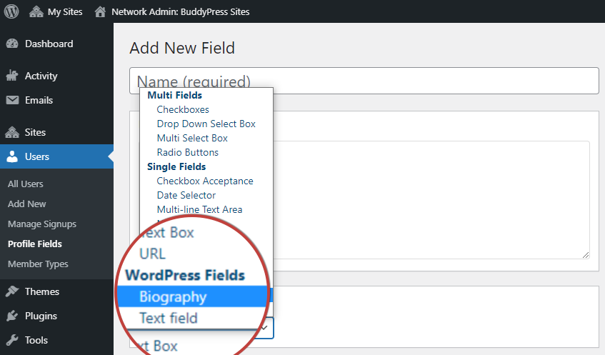 The WP Biography field type lets you include the user’s Biographical Info and thanks to the WP Textbox field you can include the first & last name, the Website URL as well as any of the custom contact methods of your users.